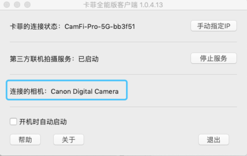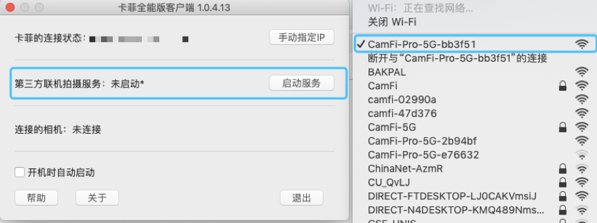 2. 打开卡菲全能版,用电脑连接 CamFi 的热点,打开安装的卡菲全能版客户端,开启服务。