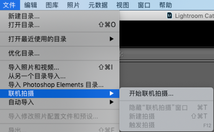 4. 打开 Lightroom,并打开文件-->联机拍摄-->开始联机拍摄,设置相关的文件夹参数,确定,即可以使用 Lightroom,并打开文件无线联机拍摄功能。