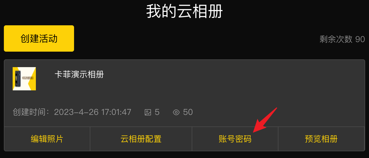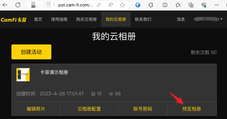 在卡菲云相册,“我的云相册”中,点击“预览相册”,可以看到传输到云相册的照片。
