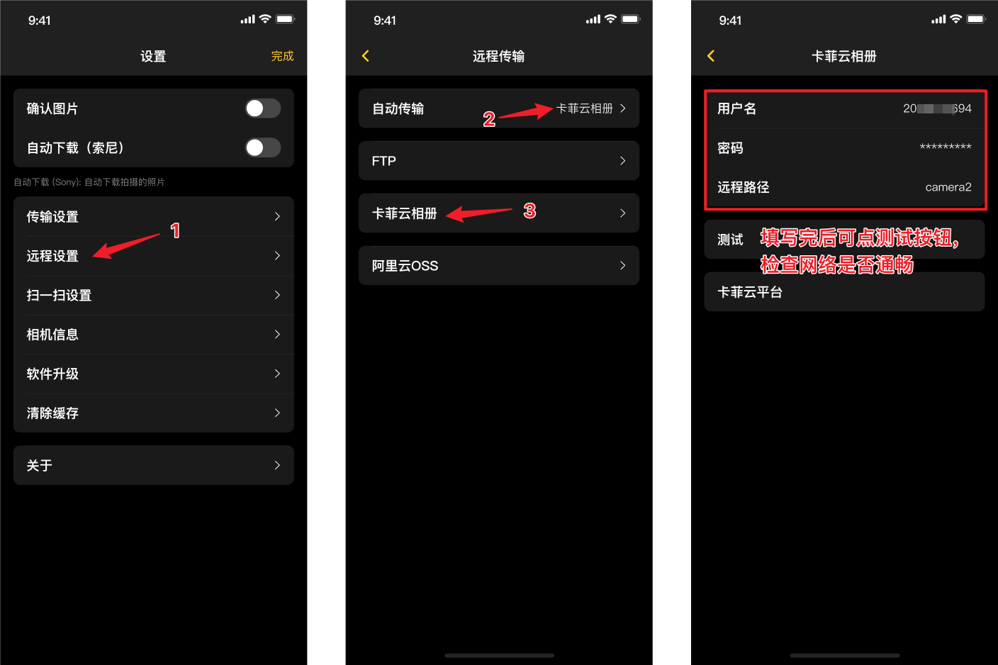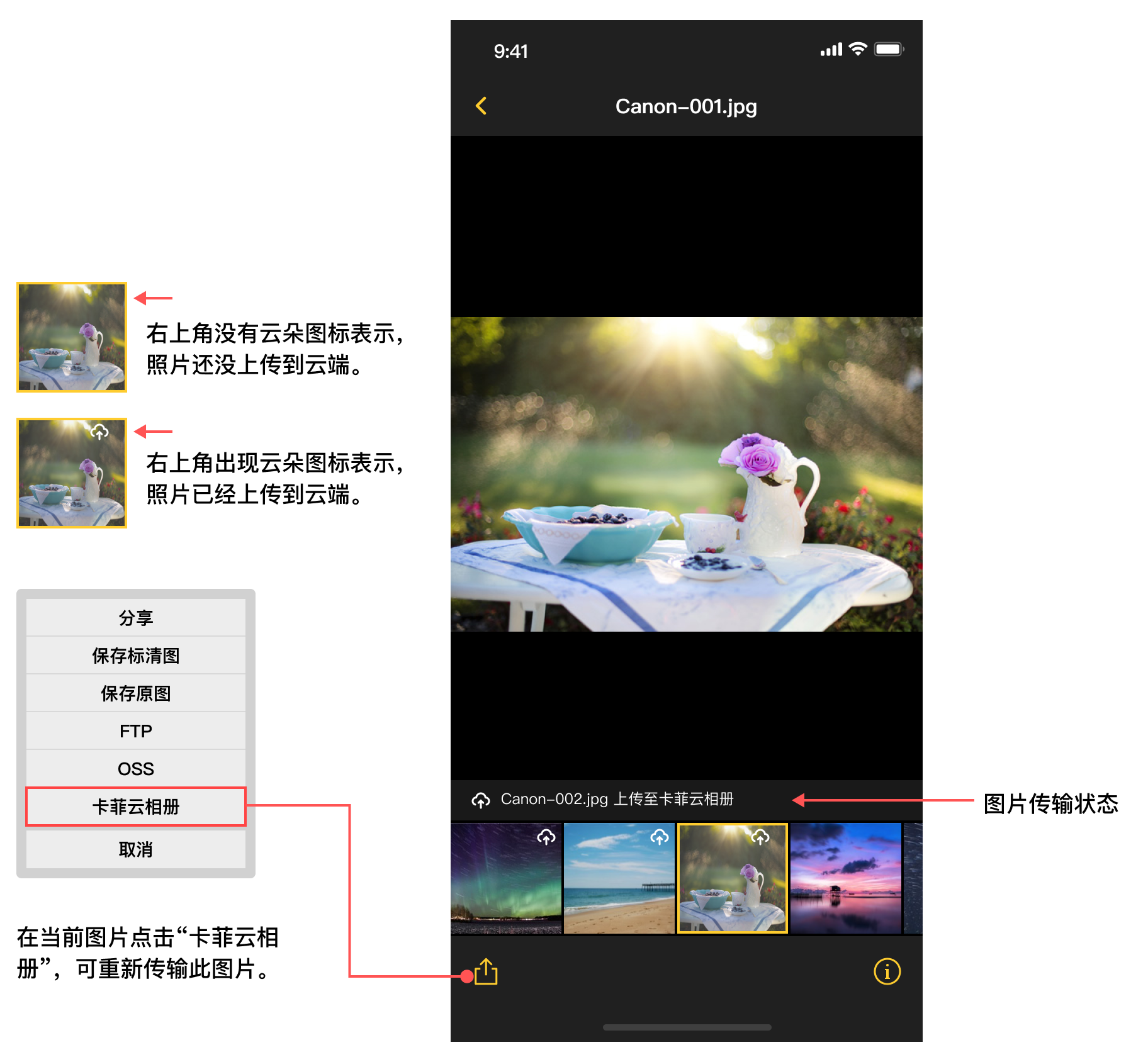 在网络通畅的情况下,拍摄的照片将自动传输的到云端。若传输失败,可在网络良好的时候,手动点击左下角按钮,选择“卡菲云相册”重新传输。